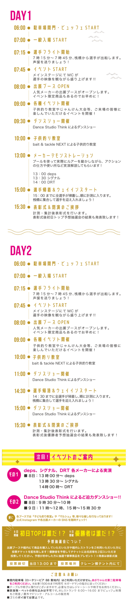– 初日:〜15:00 最終日:〜14:00